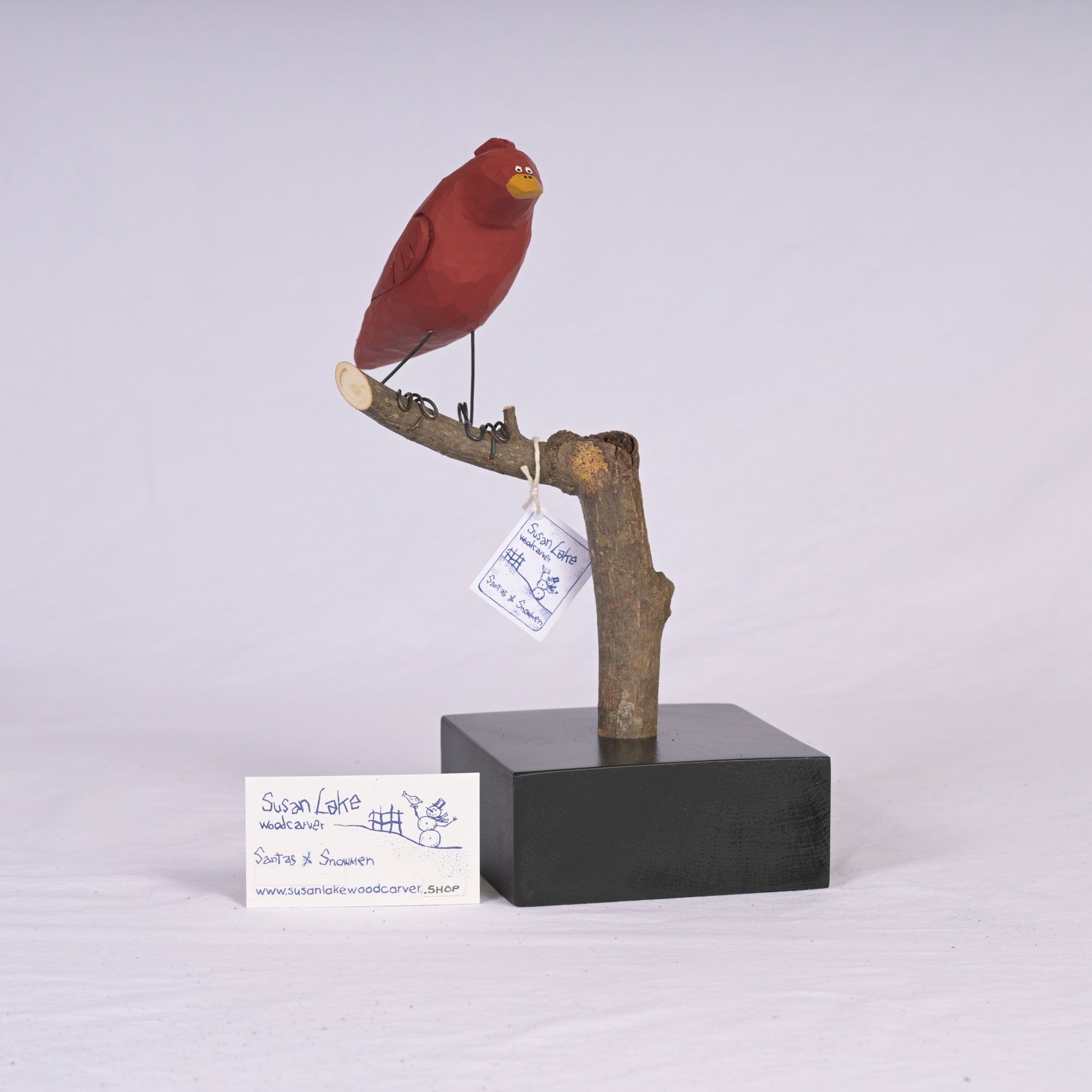 Big Red Birds (with attitude) This one is 11 1/2” tall. These birds are modeled after the Cardinals in my back yard and are hand Carved and painted by ME, Each comes mounted on a branch from my yard selected just for them. All of my bird were raised cage free…