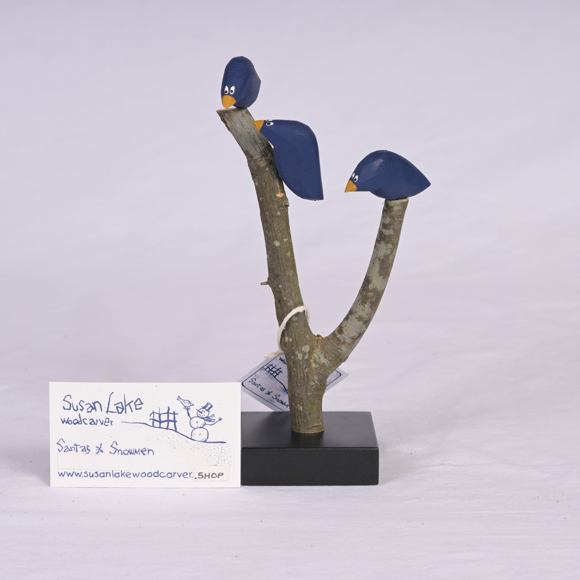Introducing Mini Birds! This is 8” tall. Mini birds are carved and painted by ME and are sitting on a branch cut from my yard selected just for them. Perfect for a kitchen window! All of my bird were raised cage free…