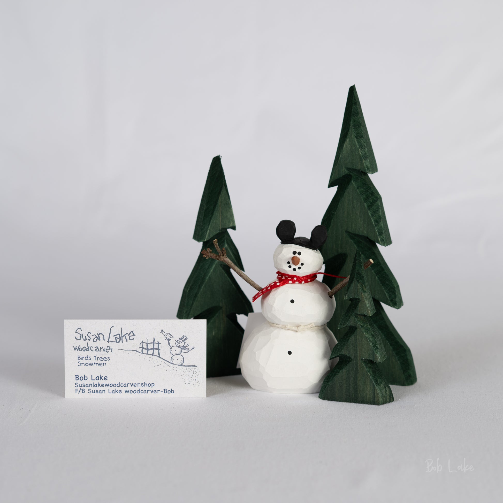 This Miniature Mouse-like Snowman bundle comes with 1 Miniature Mouse and includes 3 different size trees, 4" 6” 8”. The tall Miniature Mouse is approximately 4 1/2" tall. All Snowmen are completely hand carved and painted by ME in Newnan, Georgia. Signed and dated.