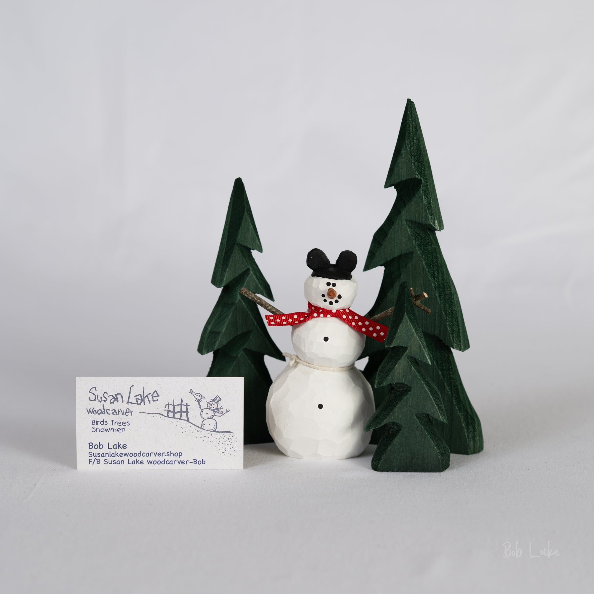 This Miniature Mouse-like Snowman bundle comes with 1 Miniature Mouse and includes 3 different size trees, 4" 6” 8”. The tall Miniature Mouse is approximately 4 1/2" tall. All Snowmen are completely hand carved and painted by ME in Newnan, Georgia. Signed and dated.