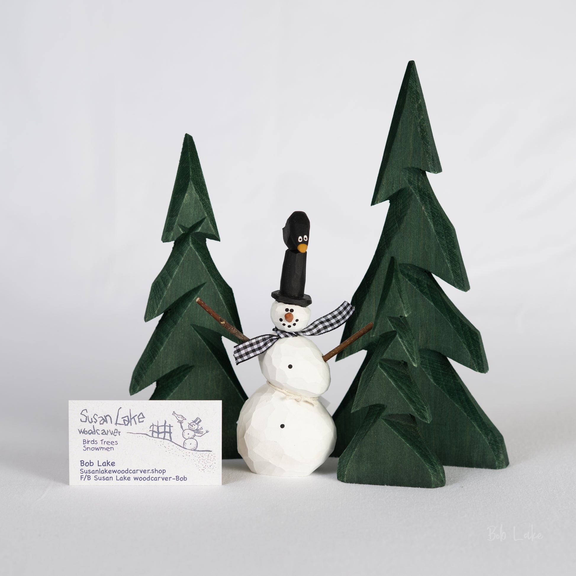 This Snowman bundle comes with 1 Snowman and includes 3 different size trees, 6" 8" 10" Snowman is approximately 6" tall and includes a Mini-Bird. All Snowmen are completely hand carved and painted by ME in Newnan, Georgia. Signed and dated.