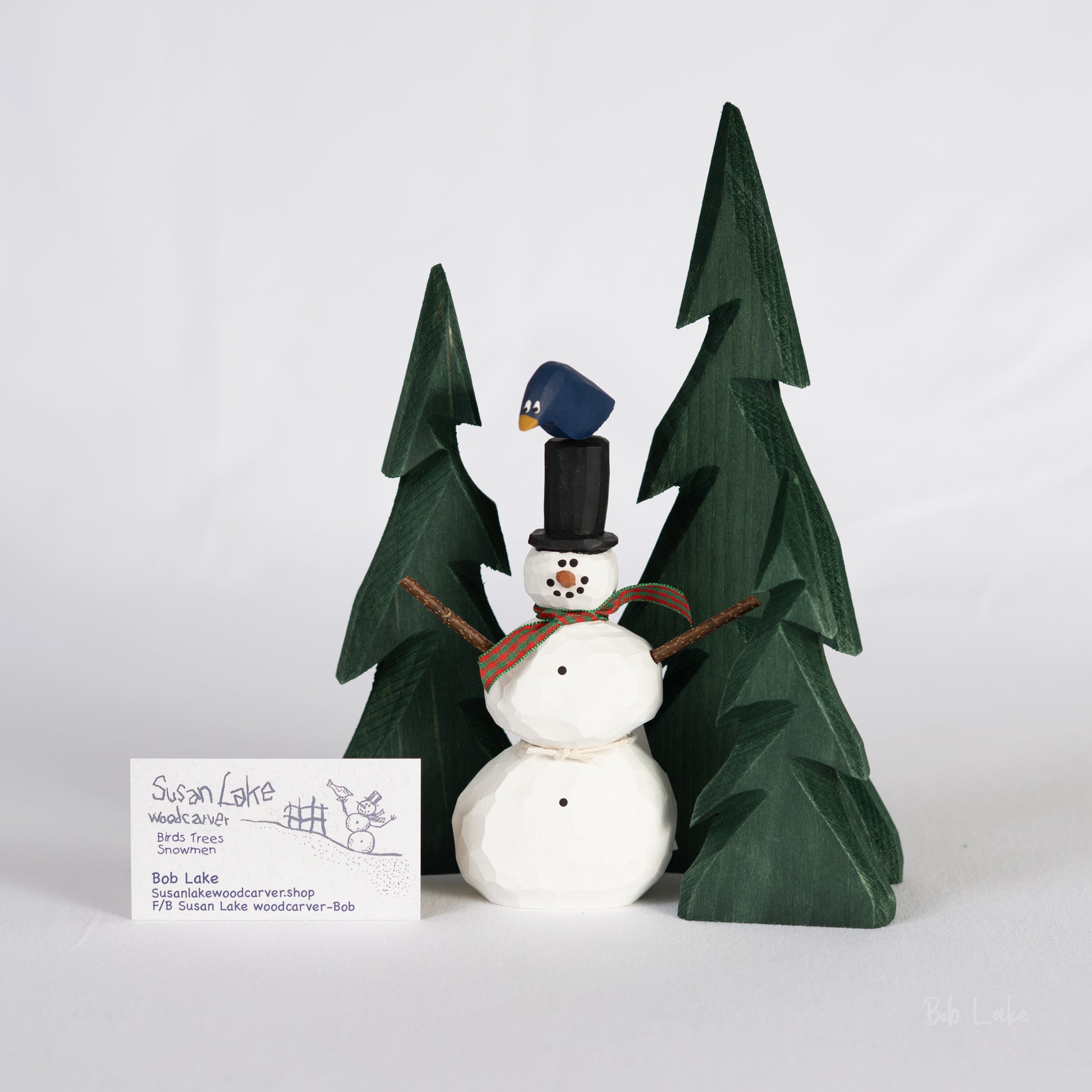 This Snowman bundle comes with 1 Snowman and includes 3 different size trees, 6” 8" 10". Snowman is approximately 6 3/4" tall and includes a Mini-Bird. All Snowmen are completely hand carved and painted by ME in Newnan, Georgia. Signed and dated.