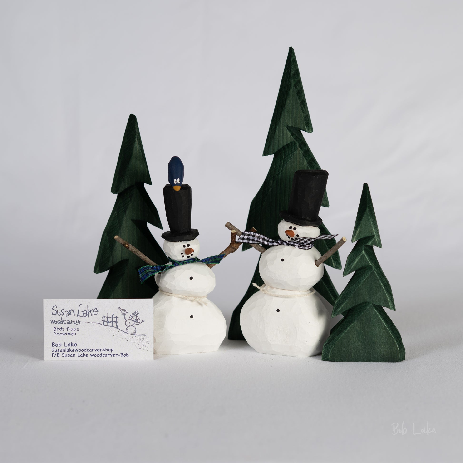 This Snowman bundle comes with 2 Snowmen and includes 3 different size trees, 6” 8” 10”. The tall Snowman is approximately 7" tall. All Snowmen are completely hand carved and painted by ME in Newnan, Georgia. Signed and dated.