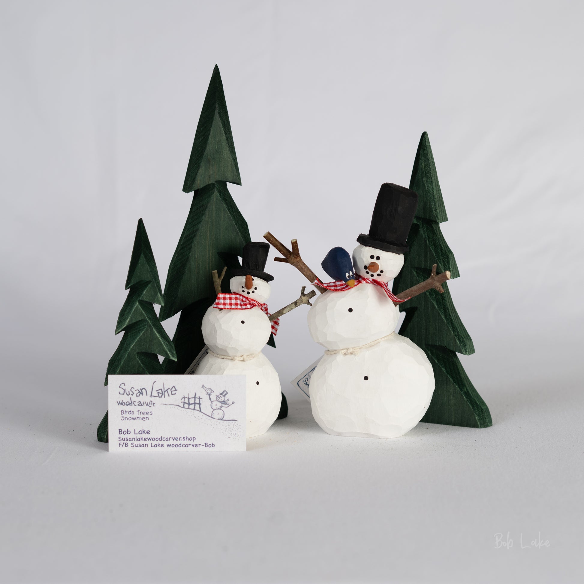 This Snowman bundle comes with 2 Snowmen and includes 3 different size trees, 6” 8” 10”. The tall Snowman is approximately 6" tall. All Snowmen are completely hand carved and painted by ME in Newnan, Georgia. Signed and dated.