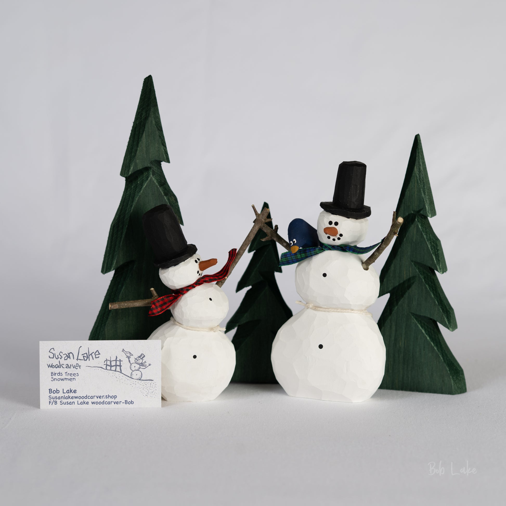 This Snowman bundle comes with 2 Snowmen and includes 3 different size trees, 6” 8” 10”. The tall Snowman is approximately 7" tall. All Snowmen are completely hand carved and painted by ME in Newnan, Georgia. Signed and dated.