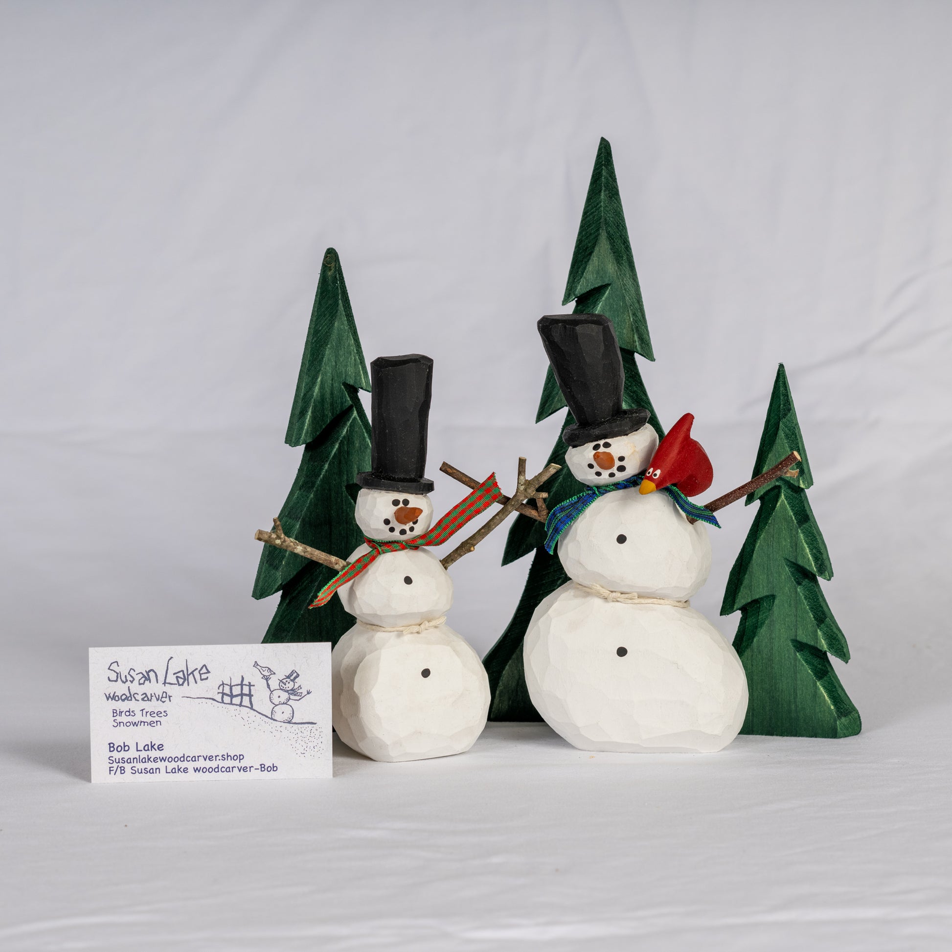 This Snowman bundle comes with 2 Snowmen and includes 3 different size trees, 6” 8” 10”. The tall Snowman is approximately 7" tall. All Snowmen are completely hand carved and painted by ME in Newnan, Georgia. Signed and dated.